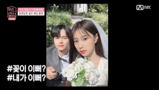 한 식구가 된 강혜원과 이대휘는 흩날리는 꽃잎을 배경으로 싱그러운 미소를 지어 아름다운 셀프 웨딩 사진을 완성했다.