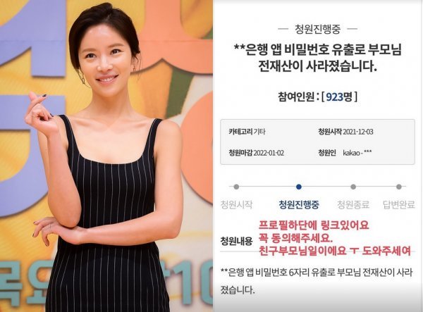 황정음, ‘은행 비번 유출로 전재산 사라져’ 친구 청원글 동의 독려