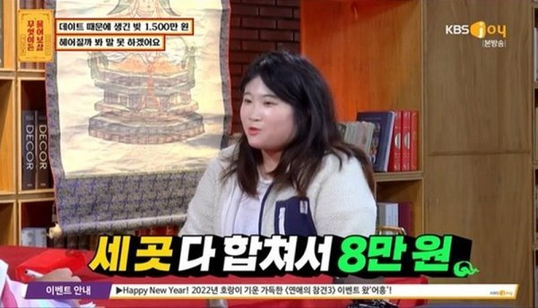 이날 방송에서 21살 대학생 고민녀는 데이트비용 1500만 원이 고민이라며 “알바도 했고 대출도 받았다. 남자친구는 이렇게까지 된 걸 몰라서 어떻게 말을 해야 할지 모르겠다”고 말했다. 남자친구는 3살 연상인 24살로 사귄지 1년이 다 돼간다고.