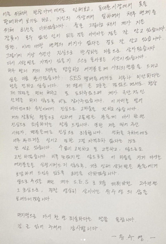슈는 S.E.S. 멤버들에게도 사과했다. 그는 멤버들에게 “나 때문에 큰 고초를 겪었으면서도 항상 내 걱정을 먼저 해주고 또 도와주었으며 내가 극단적인 선택을 하지 않도록 바로 잡아주었다”면서 “이 자리를 빌려 바다언니와 유진에게 진심으로 고마움을 전하고 싶다”고 전했다.