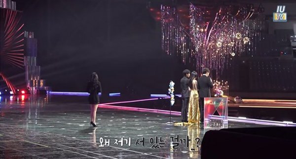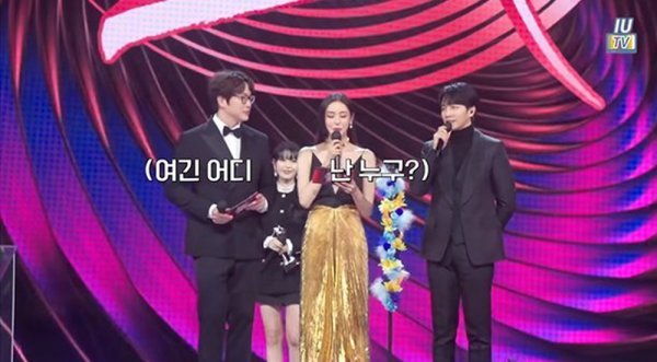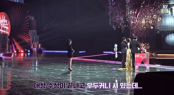 아이유는 “관계자가 내게 그냥 서 있으라고 했다. 끝나고 MC들 뒤에 서 있으라고 했다. 그래서 그냥 서 있었는데 구도상 내가 너무 이상할 것 같았다. 그래서 ‘이게 맞는 건가’ 하고 옆을 봤는데 옆에서 진행하는 사람들도 ‘그냥 있으라’고 했다”고 설명했다.