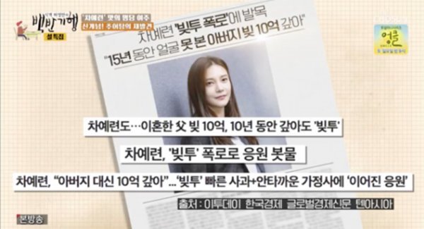19살 어린 나이에 연예계 데뷔했던 차예련은 잡지 모델로 시작해 배우로 입문한 경우다. 허영만은 “그때 나이로 상상하기 힘든 수입이었을 것 같은데, 수입 관리는 어떻게 했나”고 물었다. 차예련은 “처음에는 부모님이 다 관리하셨다. 그런데 내가 돈을 많이 버니까 부모님이 사고를 치셨다”고 논란이 된 ‘빚투’ 논란을 언급했다. 15년간 연을 끊고 지내던 부친이 ‘빚투’에 휘말려 차예련에게 10억 원이라는 거액의 빚을 안긴 것. 차예련은 그동안 꾸준히 부친 빚을 갚아 10억 원의 채무를 변제했다고.