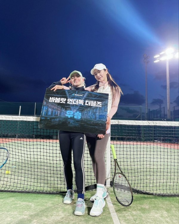 배우 홍수아가 연예인 최초로 동호인 테니스대회에서 우승했다.