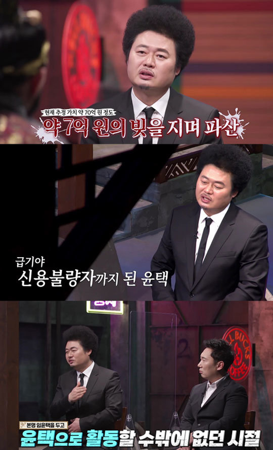 윤택은 “나는 뒷걸음칠 곳이 없다고 생각했다. 그 빚을 어떻게 갚겠느냐. 여기서 죽을 바엔 내가 하고 싶은 걸 하고 죽자고 생각했다”며 "가족들과 연락을 다 끊었고 친구들도 안 만났다. \'빚 언제 갚을 거냐\'는 전화만 왔다. SBS 개그맨이 된 후 7년간 빚 청산을 위해 노력했다. 빚을 다 갚았을 때보다 신용불량자에서 신용이 회복됐다는 문자가 왔을 때 제일 기뻤다. 이제 나도 사회 일원이 됐구나 싶었다"고 돌아봤다.
