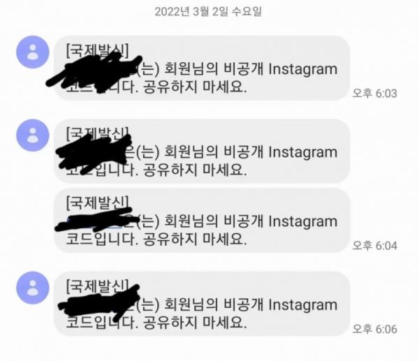 함께 공유한 사진에는 '[국제 발신] 회원님의 비공개 인스타그램 코드입니다. 공유하지 마세요'라는 내용의 문자 메시지가 여러 개 담겨 있다. 누군가 심은진의 SNS 계정을 해킹하려 한 것이다.