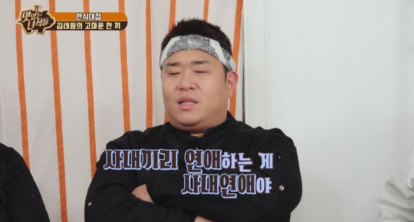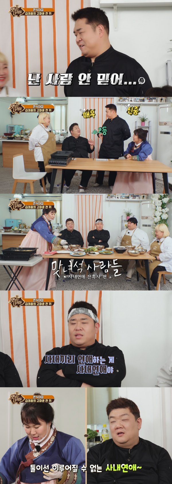 또 다른 가위바위보 승부에서 육전 굽기에 당첨된 김민경은 "옛날에 연애하던 유민상과 결혼했어야지. 둘이 사내연애를 그렇게 오랫동안 몰래 했다며?"라는 홍윤화의 질문을 받았다.