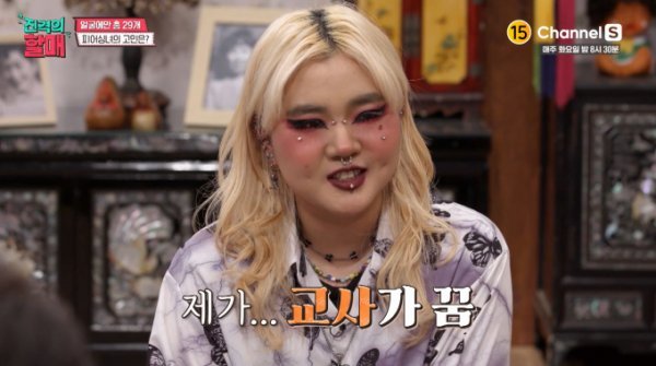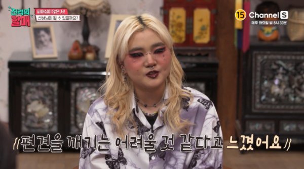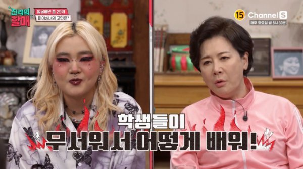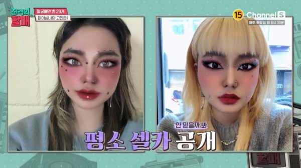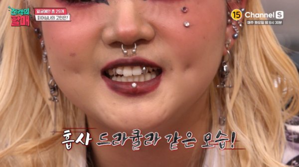 29일 방송된 채널S ‘진격의 할매’에는 사범대학에 재학 중인 23살 고민녀가 출연했다. 얼굴에 가득한 피어싱으로 할매들을 깜짝 놀라게 한 고민녀. 그는 혀와 치아에도 피어싱을 했다면서 “몸에도 뚫었지만 지금은 없는 상태다. 얼굴에 29개를 하고 왔다. 살이 집히는 곳이면 다 뚫을 수 있다. 평소에 계속 끼고 있고 양치도 그냥 한다”고 말했다.
