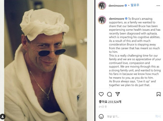 그의 전 부인이자 배우 데미 무어는 이날 자신의 SNS에 “브루스 윌리스가 건강상의 문제를 겪고 있고 최근 실어증으로 진단돼 그의 인지능력에 영향을 주고 있다”면서 “지금 우리 가족에게 정말 힘든 시간이고 여러분의 지속적인 사랑과 동정, 지원에 감사한다. 저희는 강력한 가족으로 이 일을 헤쳐나가고 있다”고 심경을 밝혔다.