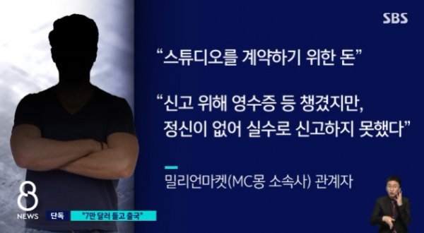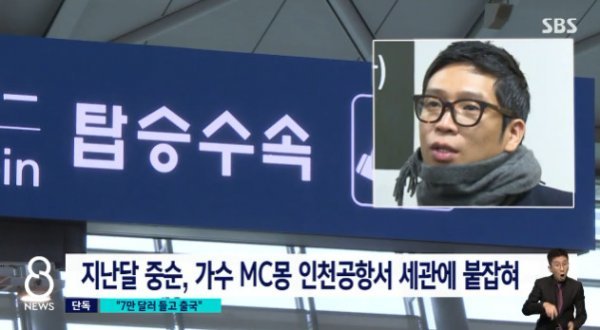 지난 13일 \'SBS 8시 뉴스\' 단독 보도에 따르면, MC몽은 지난달 중순 미국 LA로 출국하기 위해 인천공항에서 수속 절차를 진행 중이던 세관에 붙잡혔다. 세관에 신고하지 않은 7만 달러를 가방에 넣어 출국하려 한 혐의다.