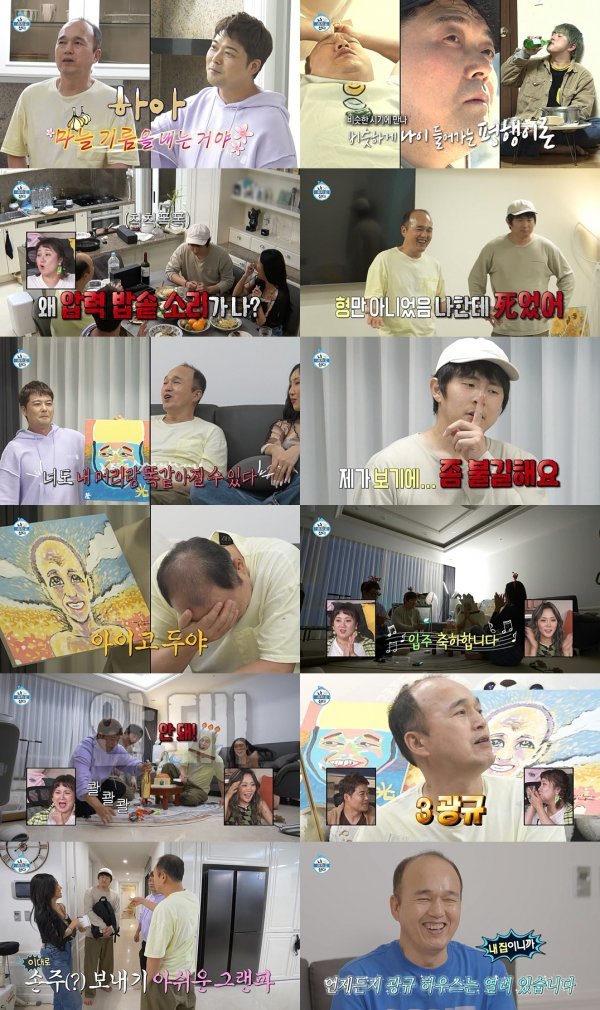 김광규와 화사는 ‘그랜파와 손녀’ 케미를 자랑하며 대환장의 집들이 중 유일한 ‘힐링 조합’에 등극, 스윗한 모습을 보여줬다. 반면 김광규와 전현무의 밑도 끝도 없는 디스전은 폭소를 유발했다. 두 사람은 서로의 약점(?)만 귀신 같이 파고들었고, 전현무는 “형만 아니었으면 나한테 죽었어. 남은 머리털을 다 뽑아버렸을 거야”라며 깐족댔다. 김광규는 “같이 다 뽑자”며 거들어 현장을 초토화시켰다.