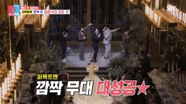 양세찬이 사회를 맡은 가운데 과거 앤디가 제작했던 그룹 틴탑이 축가를 불렀다. 축가 무대는 앤디의 세레나데로 이어지며 감동을 더했다. 퇴장 직전 양세찬의 요청으로 신화의 ‘퍼펙트맨’ 무대도 펼쳐졌다. 다리를 다친 신혜성을 제외하고 5인이 무대에 올랐고 바지가 찢어질 위기까지 올 정도로 열정적인 칼군무를 선보여 감탄을 자아냈다.