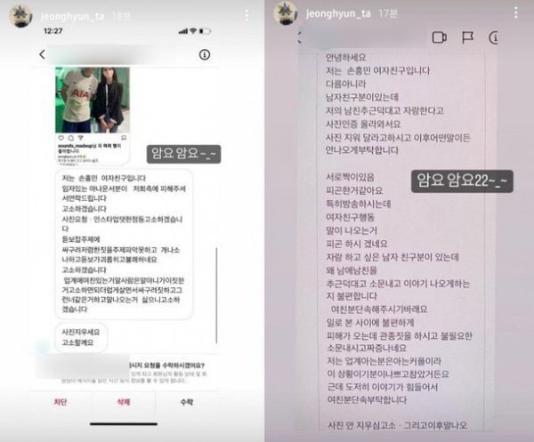 한 누리꾼은 "저는 손흥민 여자친구입니다. 임자 있는 아나운서분이 저희 측에 피해 주셔서 연락드립니다. 고소하겠습니다. 사진 요청, 인스타 업데이트한 점 등 고소하겠습니다. 듣보잡 주제에 싸구려 저렴한 짓을 주제 파악 못 하고 개나 소나 하고 듣보가 괴롭히고 불쾌하네요. 사진 지우세요. 고소할게요"라며 손흥민의 여자친구라고 사칭하고 이정현에게 막말을 남겼다.