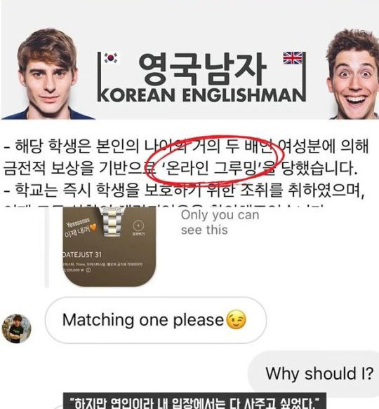 앞서 11일 유튜브 채널 ‘영국남자’의 영국 고등학생 시리즈에 출연한 A군을 둘러싸고 사생활 논란이 일었다. A군의 여자 친구라고 밝힌 30대 여성 B씨가 A군이 고가의 명품 선물을 수차례 요구했다고 주장한 것. 그러면서 “데이팅 앱을 통해 다른 여성 집에서 하룻밤을 보내 폭로를 결심하게 됐다”, “아시아 여성분들 조심하라”고 당부했다.
