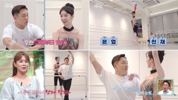 스트레칭과 기본 자세를 빠르게 마스터한 모태범은 임사랑을 들어 올리는 리프트와 중심을 잡아주는 피루엣 자세에 도전했고, 두 사람은 완벽한 호흡을 보여줬다. 특히 모태범은 임사랑의 허리를 감싸 안는 마지막 고난도 자세까지 성공시킨 후, 사랑스러운 눈맞춤을 나눠 모두의 부러움을 샀다.