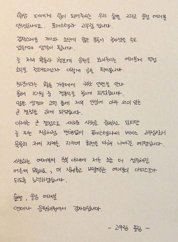 고우림은 25일 자필편지를 통해 “항상 내게 힘이 되어주시는 우리 ‘숲별’ 그리고 울림 여러분. 갑작스러운 보도와 소식에 많은 분이 놀라셨을 수도 있을 거로 생각된다”며 “늘 내 활동과 행보에 응원을 보내주는 여러분에게 직접 소식을 전하고자 이렇게 글을 쓴다”고 운을 뗐다.