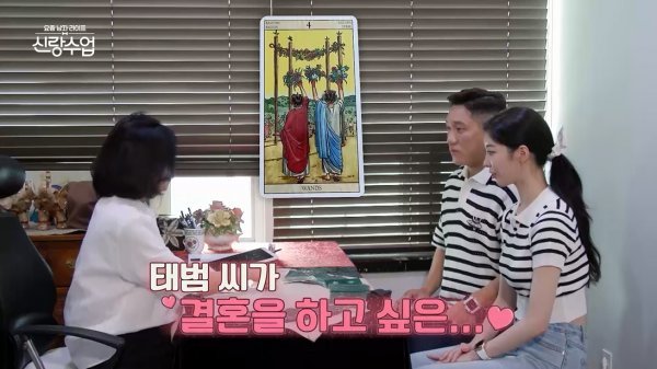 잠시 후, 임사랑이 모태범을 이끈 곳은 타로점을 보는 곳이었다. 타로점이 낯선 모태범은 당황하면서도, “사랑이와 더 좋은 일이 생길 수 있는지 궁금하다”라고 과감한 질문을 던졌다. 이에 모태범이 뽑은 카드를 본 전문가는 “태범씨가 결혼하고 싶은 카드”라며 긍정의 신호를 보냈다. 임사랑은 “오빠 주변에 저 말고 다른 이성이 많을까요?”라고 물었다. 전문가는 “모태범이 임사랑을 만나기 전 여자가 거의 없었다”고 설명해 현장을 웃음바다로 만들었다.
