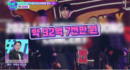 \'TMI 뉴스쇼\' 추정치에 따르면 임영웅은 올해 상반기 열린 고양, 창원, 광주에서의 콘서트로만 92억 원의 매출을 기록했다.