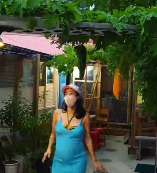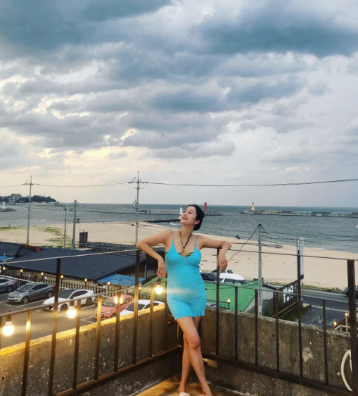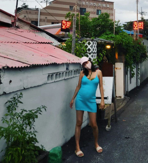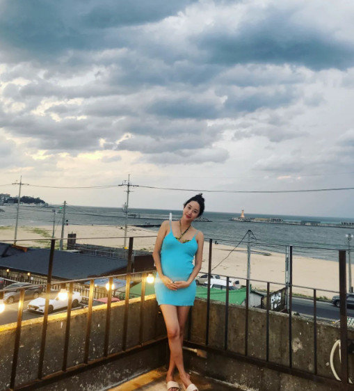 함께 공개한 사진 속 전혜빈은 볼록한 D라인을 자랑한다. 하늘색 미니 원피스에 수영복을 겹쳐입어 \'세상 힙한\' 임신부 복장으로 시선을 사로잡는다.