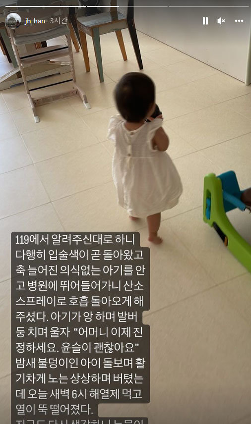 이어 “택시 아저씨한테 미친 사람처럼 빨리 가달라고 울면서 부탁하고 119에 전화하니 평평하게 눕힌 후에 고개 오른쪽으로 돌려 기도 확보해주라고. 알려주신 대로 하니 다행히 입술 색이 곧 돌아왔고 축 늘어진 의식 없는 아기를 안고 병원에 뛰어 들어가니 산소 스프레이로 호흡 돌아오게 해주셨다. 아이가 앙 하며 발버둥 치며 울자 ‘어머니 이제 진정하세요. 윤슬이 괜찮아요’”라며 병원에서의 상황을 전하기도 했다.