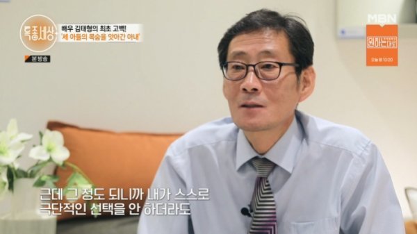 22일 밤 방송된 MBN ‘특종세상’에서는 아내로 인해 세 아들을 잃은 중견배우 김태형이 출연했다. 현재 80대 어머니와 단둘이 살고 있는 김태형은 친구의 권유로 6개월 전부터 아파트 분양사무소에서 근무 중이라고 근황을 밝혔다.