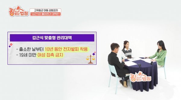 정혜진 변호사는 “김근식은 재범 위험성 평가에서 여전히 고위험군”이라며 “1대1로 보호관찰관이 붙고 10년간 전자발찌를 차게 되며 19세 미만 여성 접촉 금지, 밤 10시부터 오전 9시까지 외출 금지 등 관계부처에서 할 수 있는 조치는 다 했지만 불안한 것은 사실”이라고 짚었다.