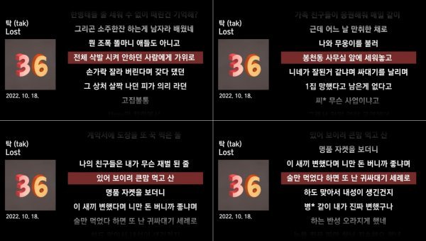 탁은 18일 배치기 유튜브 채널에 공개한 신곡 ‘Lost(로스트)’ 가사를 통해 데뷔 초 MC 스나이퍼로부터 갑질과 가스라이팅, 폭행 등을 당했다고 주장했다. 그는 “갓 스물 먹은 애들 데리고 영웅 행세/그 마음에 들지 않으면 X대기를 날린 엄석대/한병태들 줄 세워 수없이 때린 건 기억해?/그리곤 소주 한 잔 하는 게 남자라고 배웠네” 등의 가사로 피해를 거침없이 폭로했다.