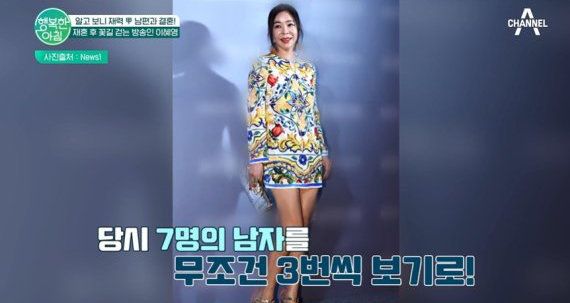 그러면서 "선 같은 소개팅을 굉장히 많이 받았다, 당시 7명의 남자를 세 번씩 만났고 7번째 남자가 현재 남편이다"라고 말했다. "7명의 남자가 동시에 이혜영씨를 사랑했다. 이혜영씨 남편이 이 사실을 알자마자 아무도 못 만나게 매일매일 이혜영씨와 만날 약속을 잡았다고 한다"고 설명해 눈길을 끌었다.