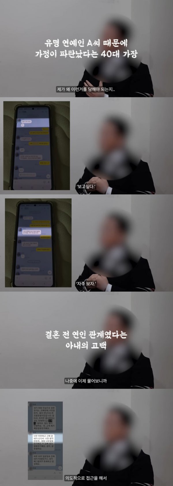 해당 영상는 유명 연예인 A씨 때문에 가정이 파탄 났다는 40대 가장 B 씨의 인터뷰가 담겨있었다. B 씨는 “너무 가슴이 찢어지고, 제가 왜 이런 거를 당해야 되는지”라며 “예전에는 톱스타였고 아이돌이고 그랬던 분인데 왜 진짜 그 유명 연예인이 연락을 안 하면 되지 않냐”라고 호소하고 있다.