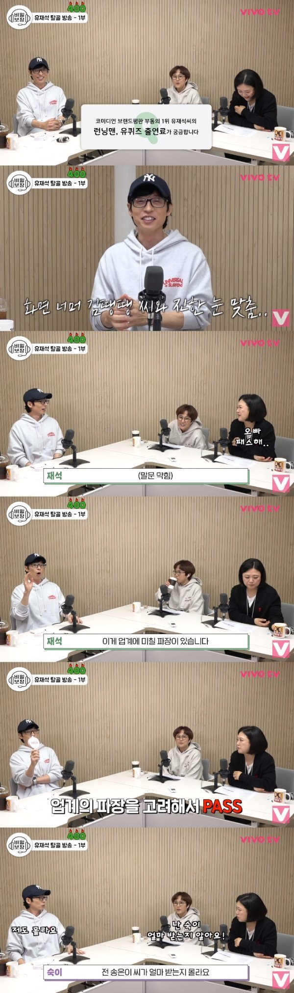 김숙은 “사실 연예인끼리도 상대 출연료를 잘 모른다”고 했다. 유재석도 “모른다. 이건 업계에 일반적인 일”이라고 거들었다. 김숙은 “난 송은이 출연료가 어떻게 되는지 모른다”고 말했다. 이에 송은이는 “나는 김숙이 출연료로 얼마 받는지 안다. 내가 올리브 ‘밥블레스유’를 제작했으니 알 수 있다”고 했다. 김숙은 “그때와 지금 내 출연료가 많이 다르다”고 반박했다. 송은이는 “많이 차이 난다고 들었다”고 정정했다.