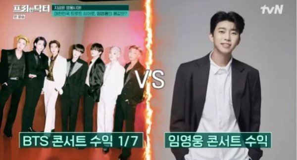 10일 방송된 tvN \'프리한 닥터\'는 \'돈방석에 앉은 트로트 제왕\' 특집으로 꾸며졌다. 이날 1위는 이변 없이 임영웅이 차지한 가운데, 연예부 기자는 "요즘 업계에서 임영웅의 출연료는 \'부르는 게 값\'이라는 이야기까지 나온다. 몸값은 측정 불가다. 현재 가치는 1000억 원은 기본으로 넘어간다고 본다. 콘서트 매출만 305억 원이다. 방탄소년단의 경우 매출을 7명으로 나눠야하지 않나. 개인 수익을 비교했을 때 임영웅이 방탄소년단을 이긴다고 본다"고 설명해 눈길을 끌었다.