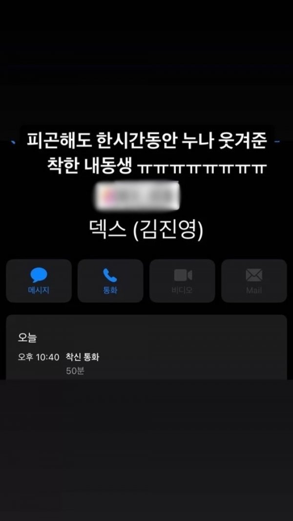 박지민 아나운서는 지난 25일 인스타그램 계정에 “피곤해도 한 시간 동안 누나 웃겨준 착한 내 동생”이라는 글과 사진을 올렸다. 공개된 사진에는 캡처된 통화 내역이 담겨 있다. 박지민 아나운서와 통화한 상대는 덱스다.