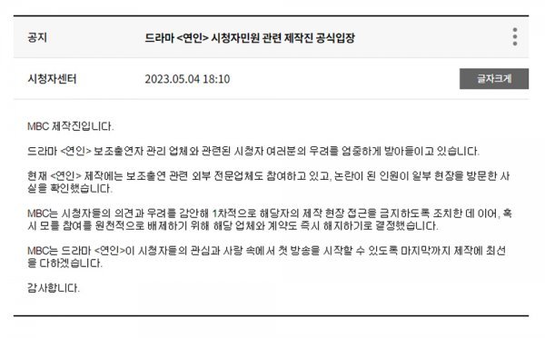 MBC 제작진입니다. 드라마 <연인> 보조출연자 관리 업체와 관련된 시청자 여러분의 우려를 엄중하게 받아들이고 있습니다. 현재 <연인> 제작에는 보조출연 관련 외부 전문업체도 참여하고 있고, 논란이 된 인원이 일부 현장을 방문한 사실을 확인했습니다.