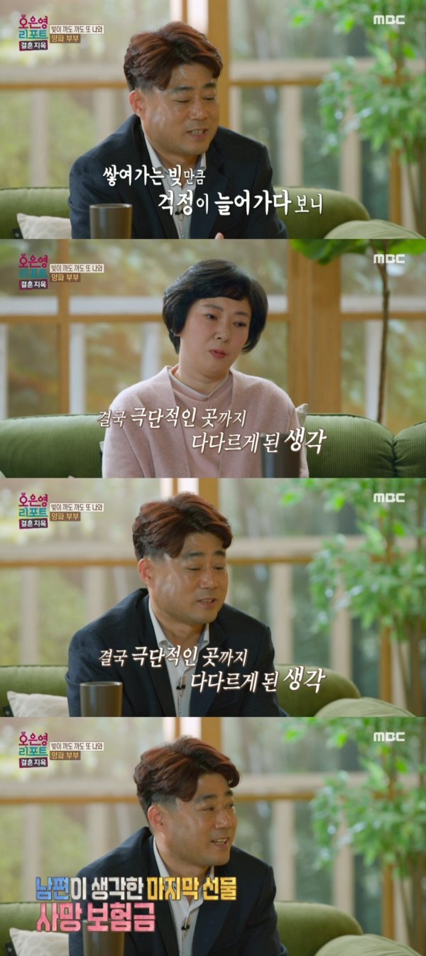 이어 부부의 또 다른 문제가 공개됐다. 경제 상황을 파악하는 것이 우선일 것 같다는 오은영 박사의 요청으로 재무 상담을 받은 두 사람. 상담 중 전문가는 “왜 이렇게 보험료를 많이 내시는 거냐”며 물었다. 빚더미에 앉은 상황에도 부부 합해 월 250만 원의 보험료를 내고 있었던 것. 아내는 “최근까지 남편이 사망 보험료만 월 400만 원을 냈었다”고 고백해 모두를 깜짝 놀라게 했다. 이에 남편은 “아이들에게 빚을 대물림해 주고 싶지 않은 마음이었다”며 털어놔 안타까움을 더했다.