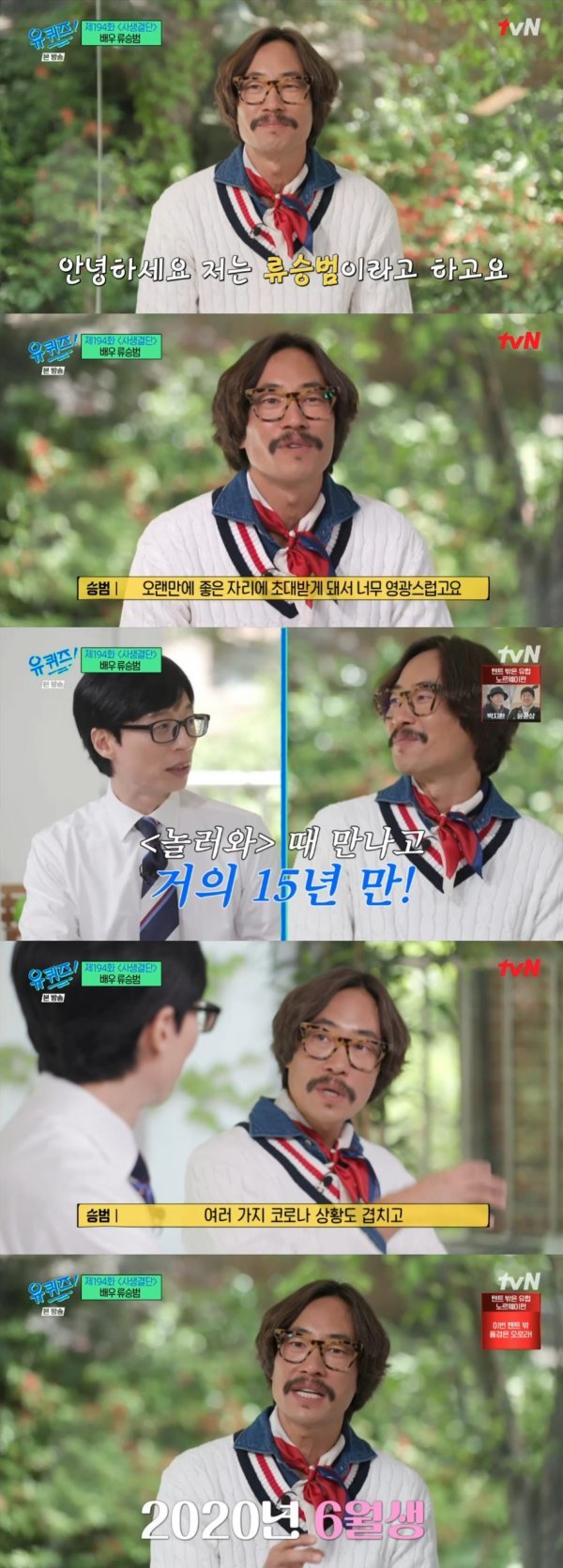 이날 류승범은 인사를 건네며 “오 떨리네요”라고 말한 뒤 “좋은자리에 초대받게 돼 영광스럽다”라고 덧붙였다. 이에 유재석은 “여전히 멋있다. 연예인 같다”라고 말했다.