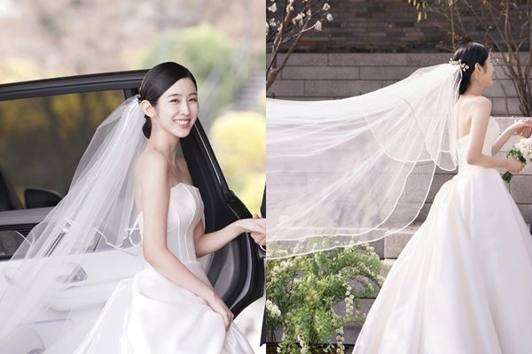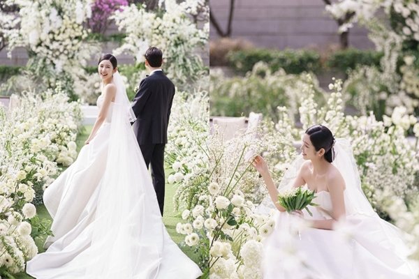함께 공개된 사진에는 결혼식 당일 웨딩드레스를 입고 밝은 미소를 짓고 있는 박지현의 모습이 담겼다. 그는 순백의 드레스를 입고 우아하고 아름다운 미모로 보는 이들의 시선을 사로잡았다.