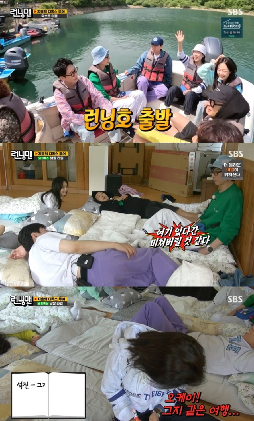 두 번째 스케줄은 ‘산채 정식 점심’이었다. 음식 포장을 위해 유재석, 지석진, 전소민은 직접 배를 타고 나가야 했고 멤버들 몰래 도토리묵 식사를 감행했다. 세 사람은 잠깐의 외출이 끝나자 “감옥에 들어가는 것 같다”며 허탈해했다.