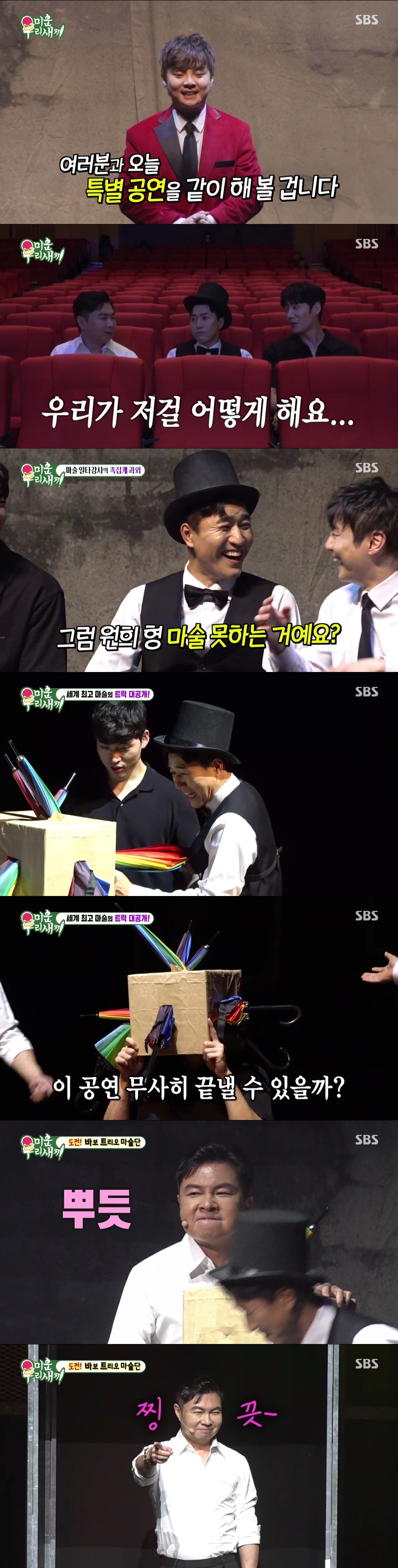 김종민과 임원희, 최진혁 바보 트리오가 마술사 최현우의 공연장을 찾았다. 최현우의 마술 공연 무대에 올라 직접 마술을 선보이는 데 도전한 것. 이들을 맞이한 최현우가 시범 마술을 선보이자 바보 트리오는 물론, 母벤져스 모두 입을 다물지 못하고 빠져들었다.