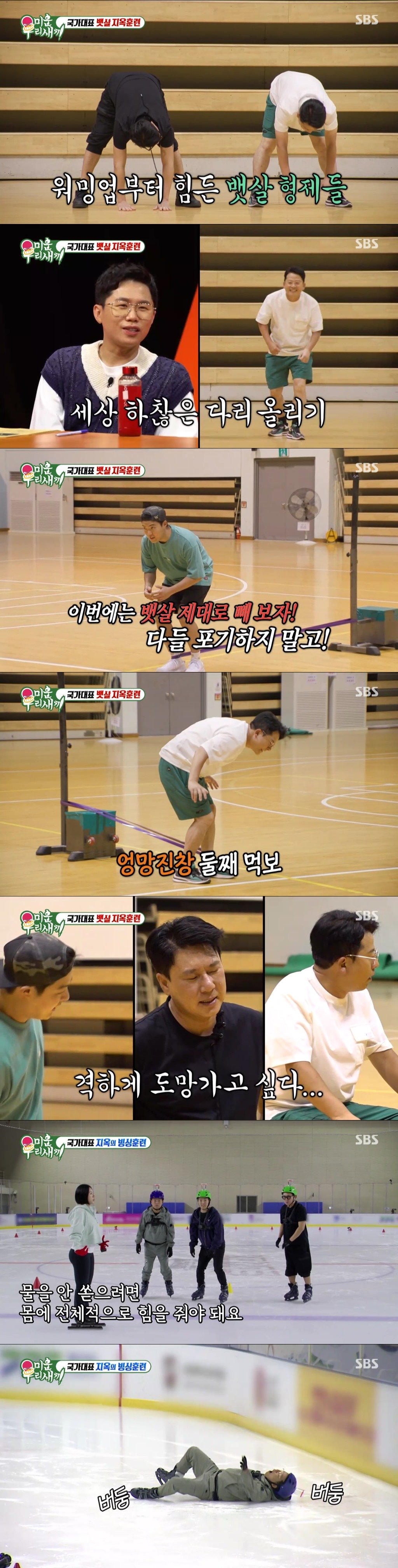 이상민과 김준호, 강남이 국대 운동 끝판왕 이상화를 운동 선생님으로 모시고 특별훈련에 임했다. 이상화는 워밍업부터 삐걱거리는 이상민과 김준호를 보고 “고장 난 수도꼭지 같아, 녹이 슬었어”라며 날카로운 멘트를 날려 긴장감을 자아냈다. 국대 선수들이 하는 고강도 허벅지 밴드 운동을 시작하자 곧잘 버티는 상민, 강남과는 달리 균형을 잡지 못하고 부실한 하체를 인증하는 준호 때문에 스튜디오에 웃음이 터져 나왔다.
