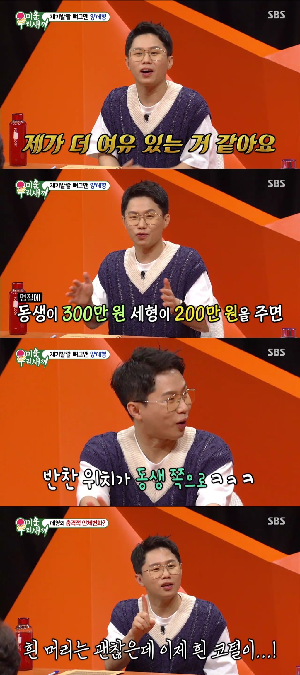 이날 ‘미운 우리 새끼’에는 개그맨 양세형이 스페셜 MC로 출연했다. 5년 전 미우새에 동생 세찬과 출연해 남다른 형제 케미를 뽐냈던 양세형은 “둘 중 수입은 누가 더 버느냐”라는 경환 母의 기습 질문에 진땀을 흘리며 “평소에 어머니께 드리는 용돈 스케일을 보면 제가 조금 더 버는 것 같다”라고 대답했다. 이어 양세형은 “명절에 동생보다 적게 용돈을 드렸더니 반찬을 동생 쪽으로 몰아주시더라”라고 말해 큰 웃음을 자아냈다.