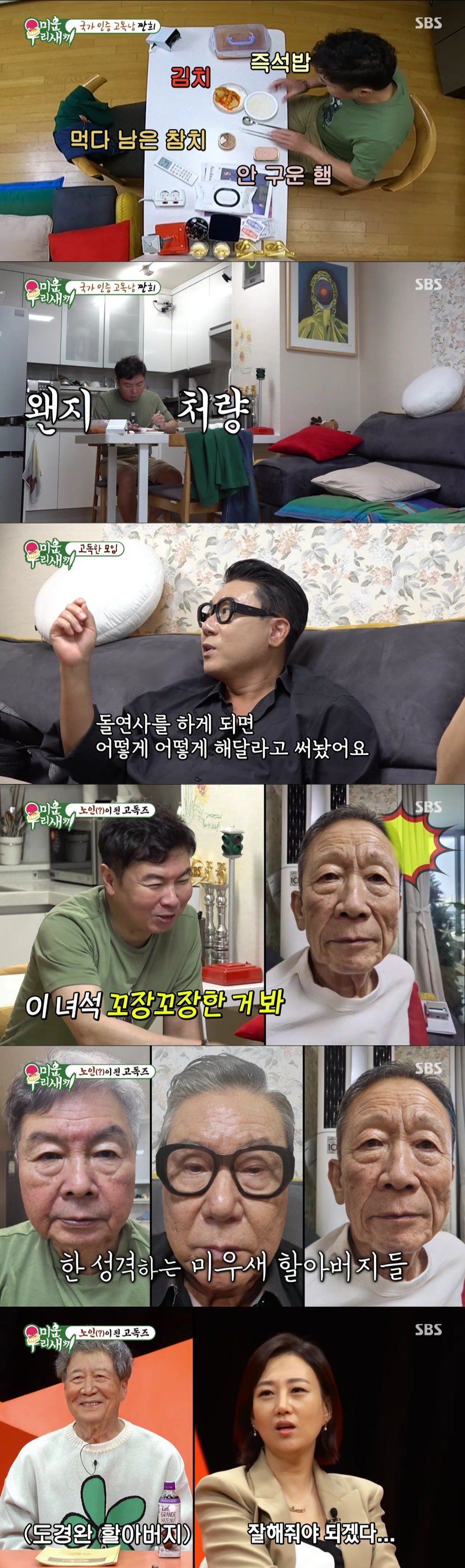 최근 보건복지부 고독사 방지 공익광고를 찍은 임원희의 고독 일상이 그려졌다. 쉬는 날 먹다 남은 참치캔과 김치, 굽지 않은 햄, 즉석 밥으로 대충 첫 끼니를 때우는 임원희의 모습에 스튜디오에 탄식이 흘렀다. 이어 석용과 상민이 찾아와 5060대 고독사에 대한 생각을 나눴다. 이상민은 “돌연사를 대비해서 이렇게 저렇게 정리해 달라 유서를 썼다. 자필로 써서 인감도 찍어 놨다. 내가 죽으면 정리해 줄 사람이 없으니까”라고 말해 모두를 숙연하게 했다.
