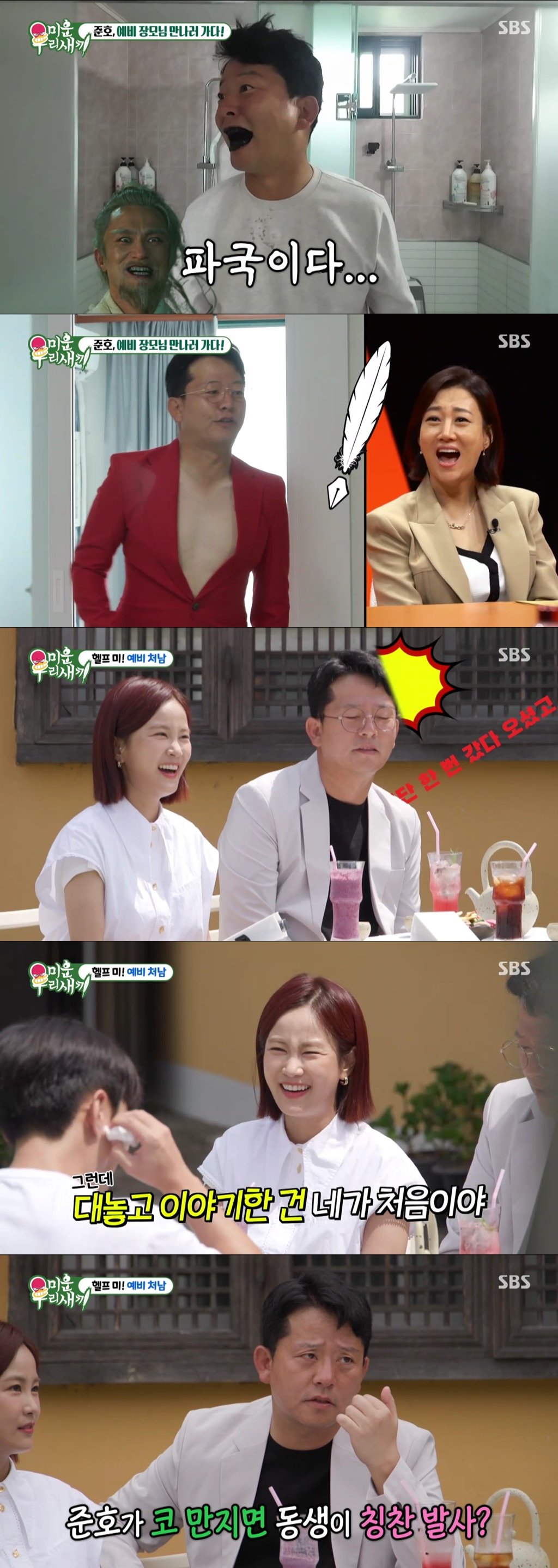 이어 두 사람은 김지민의 남동생을 만나 어색하게 인사를 나눴다. 지민과 사귄다고 했을 때의 동생으로서의 심경을 묻자 지민의 남동생은 “누나가 뭐가 아쉬워서 한번 갔다 오신 분을”이라고 솔직하게 말했고, 김준호는 당황하면서도 “지민이를 생각하는 건 내가 1등이다”라며 깨알같이 본인의 장점을 어필했다. 어머님 앞에서 개그를 선보일 테니 크게 호응해달라는 김준호의 주문에 남동생은 기합까지 내지르며 심기일전하는 모습을 보였지만, 이내 “나 못하겠어”라고 난색을 표해 큰 웃음을 자아냈다. 어영부영 지민의 남동생을 포섭하는데 성공한 김준호는 드디어 예비 장모님을 만나러 집을 방문했다. 과연 예비 장모님과의 첫 만남은 어떤 모습일지, 다음 주 공개될 이야기에 기대감이 고조됐다.