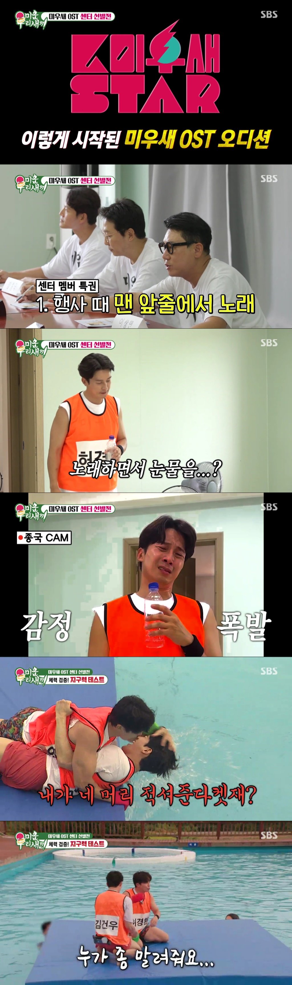 이어 수영장에서 체력 테스트를 진행한 미우새 아들들. 상대의 발바닥에 적힌 이름을 때수건으로 지워야 승리하는 게임에 나선 김건우는 허경환을 상대로 팽팽한 게임을 이어갔다. 급기야 허경환이 “누가 좀 말려줘요. 눈이 돌았다니까 지금”이라고 다급하게 외치자 폭소가 터져 나왔다.