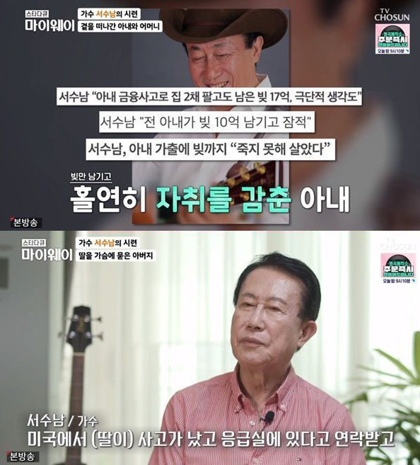 지난 3일 저녁 7시 50분 방송된 TV CHOSUN ‘스타다큐 마이웨이’에서는 대한민국 1세대 포크 & 컨트리송 가수 서수남이 출연해 근황을 전했다.