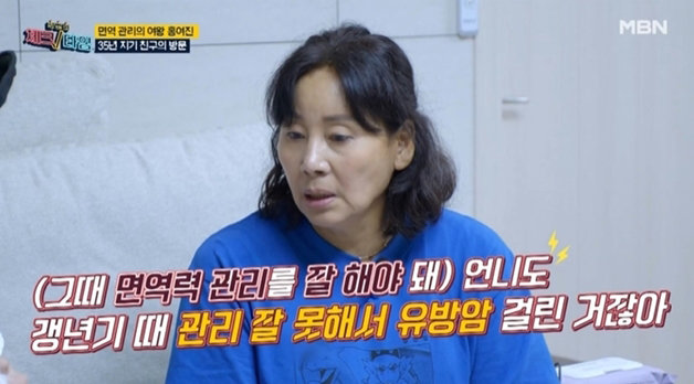 홍여진은 2005년도 47세의 나이에 유방암 진단을 받았고 8년 전 완치 판정을 받았다. 그는 35년 지기 절친 개그우먼 김현영의 방문에 평소 기록해둔 건강 관리용 음식 레시피를 공개하며 “여성 갱년기는 호르몬 변화 탓이다. 내가 갱년기 때 관리를 잘 못 해서 유방암에 걸렸다. 음식 관리가 중요하다”고 설명했다.