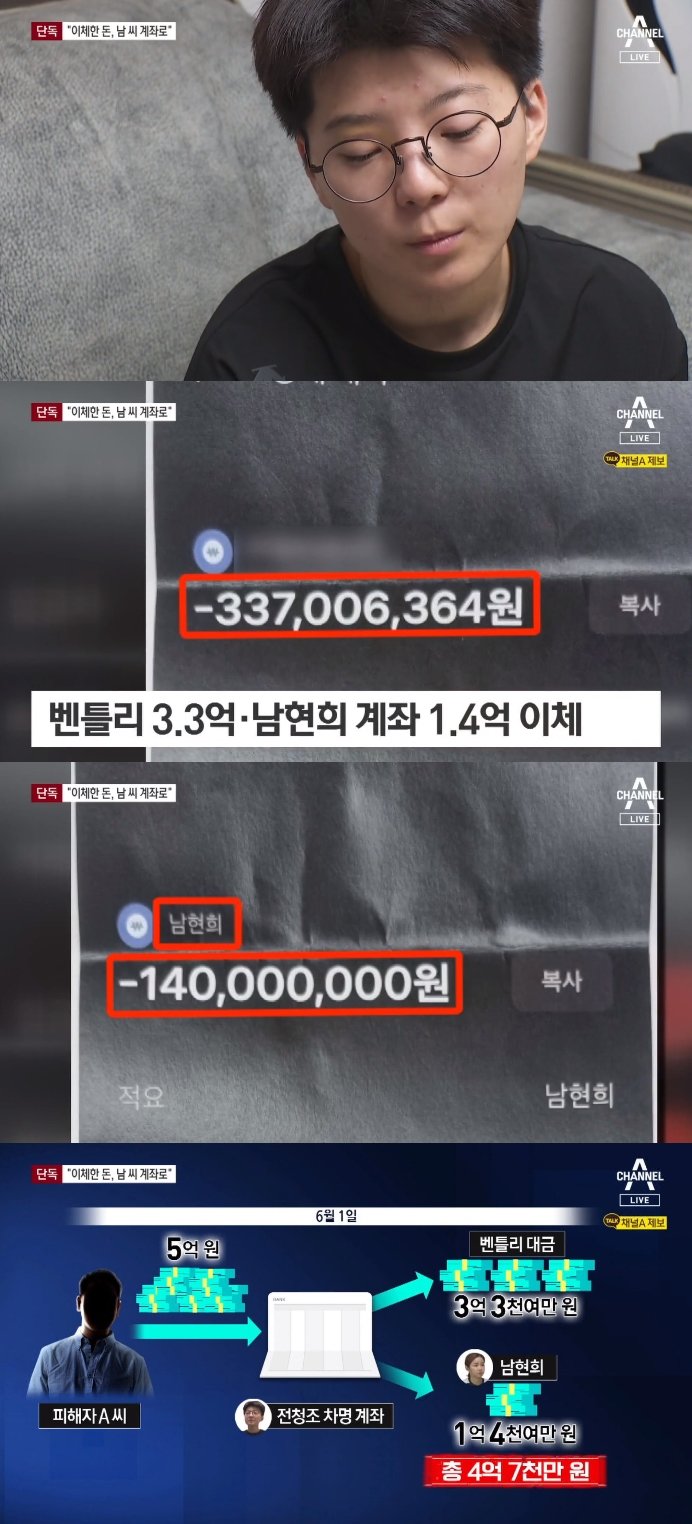 문제는 같은 날 해당 계좌에서 두 차례 거액이 빠져나갔다. 벤틀리 대금이라며 남현희 이름으로 3억 3000만 원. 또 남현희 본인 계좌로 1억 4000만 원이 이체됐다.