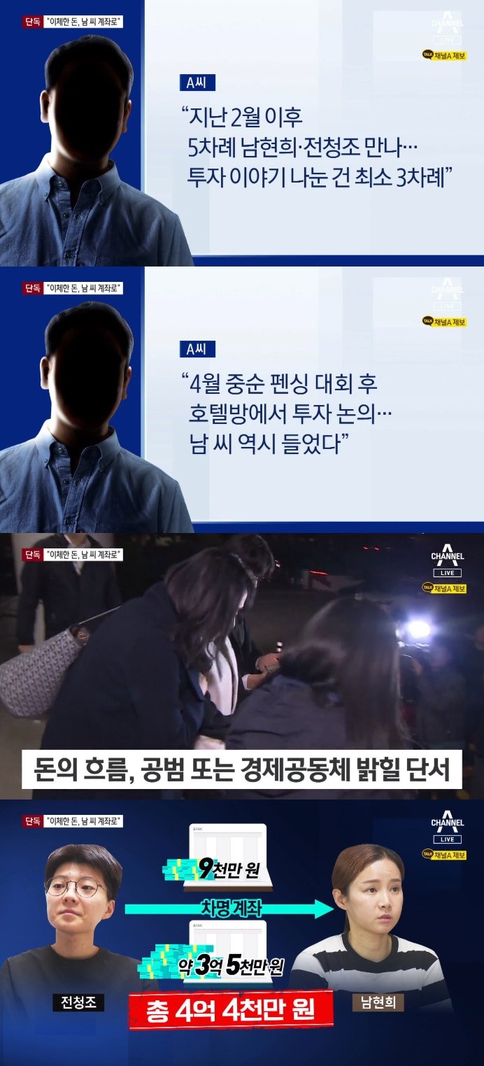 채널A는 10일 “전청조에게 11억 원을 투자했던 남현희 펜싱 아카데미 학부모 A 씨 부부가 송금한 돈이 남현희에게 흘러갔다고 주장한다”며 “입수한 전청조 차명계좌 내역를 들어야다 보니 학부모 A 씨 부부 돈을 포함해 남현희 계좌로 들어간 돈이 최소 4억 원이 넘었다”고 최초 보도했다.