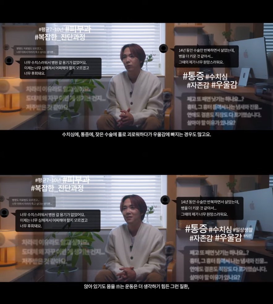 그러나 이런 상황에서도 다른 사람들에게 증상을 말하기 민망했다고. 이홍기는 “‘종기’라는 단어에서 나오는 거부감이 컸던 것 같다”라며 “지금은 ‘화농성 한선염’이라는 정확한 병명이 있지만, 어렸을 때는 이 병에 대해서 고통받고 있다고 말하면 주변에서 ‘종기야’라고 했다”고 말했다.
