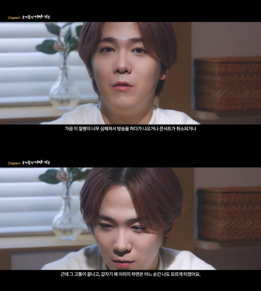 중학생 때부터 화농성 한선염을 앓았다는 이홍기는 “(통증이 심해지면) 방송 도중에 나오거나 콘서트가 취소된 적도 있었다”며 “걷지도 못하고, 움직일 수도 없고, 노래도 더는 할 수 없었다. 비행기도 타지 못했다”고 이야기했다.
