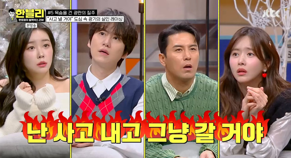 한편, 대낮 서울 한복판에서 벌어진 외제차 두 대의 위험천만한 레이싱 사건에 주목했다. 운전자는 과속은 물론 신호 위반으로 액션 영화를 방불케 하는 무모한 질주를 하며 ‘나는 신호 다 무시할 거야’, ‘사고 낼 거다’ 등의 믿을 수 없는 대화가 녹음돼 경악케 했다. 결국 두 차량 모두 사고에 휘말리고 시동이 걸리지 않자 도주했다고 해 이승현은 ‘칼 들고 휘두르는 살인미수와 다름 없다’며 분노를 표출했다.