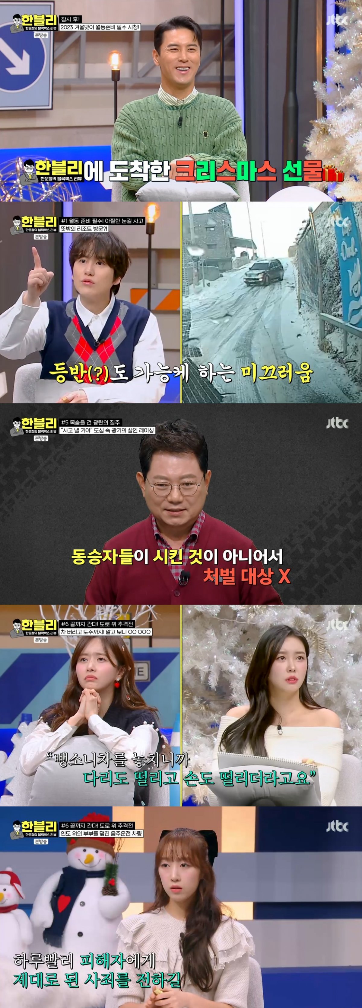 한문철 변호사는 야간에 의문의 차량이 인도를 덮치면서 길에 서 있던 부부 중 남편이 그대로 차에 치이는 장면이 담긴 블랙박스 영상을 공개했다. 아내의 “도와주세요”라는 절규에 나타난 오토바이가 사고 조치도 없이 현장을 벗어난 도주 차량을 추격해 검거에 성공, 음주 상태인 것을 밝혀냈다.